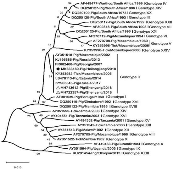 Analysis of the MK333180-Pig/Heilongjiang/2018 (Chinese pig/HLJ/18) based on its partial p72 gene. The white triangles mark the ASFV sequences from the first case in China. Scale bars indicate nucleotide substitutions per site. ASFV isolated in China and Russia share high homology and belong to genotype II [223].