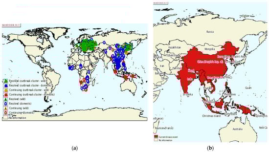 ASF epidemic. (a) Global ASF epidemic situation from 2015 to 2020; (b) prevalence of ASF in Asia from July to December 2020 [228].