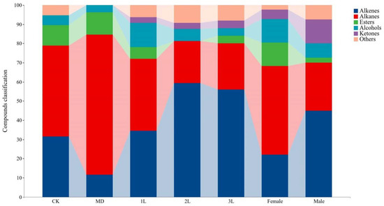 Variation in volatile compounds classification of the A. philoxeroides treated with clean plants (CK), mechanical damaged (MD), infested by 1st instar (1L), 2nd instar (2L), 3rd instar (3L), females and males of A. hygrophila.