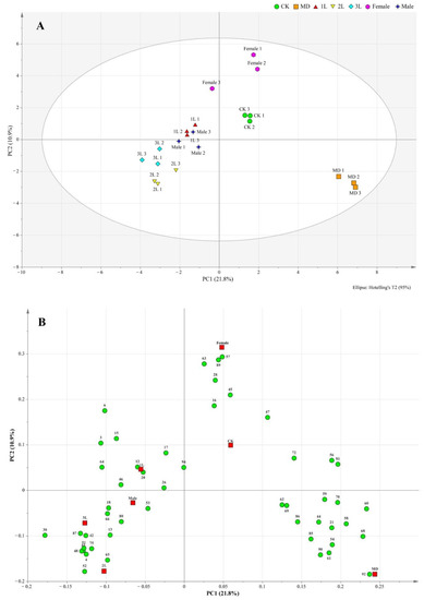 Score scatter plot (A) and loading scatter plot (B) of orthogonal partial least squares-discrimination analysis (OPLS-DA) based on headspace composition of A. philoxeroides treated with clean plants (CK), mechanically damaged (MD), and infested by 1st instar (1L), 2nd instar (2L), 3rd instar (3L), females and males of A. hygrophila. For compound identity in relation to the numbering in the loading plot, please refer to Table 1.
