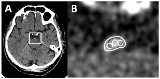 Methods of thrombus delineation. (A) Axial CT section with a hyperdense basilar artery. (B) Magnified region of interest (white box) with the three methods of thrombus delineation. Method 1: black RoI, Method 2: three white circles, Method 3: large white RoI.