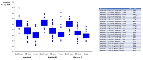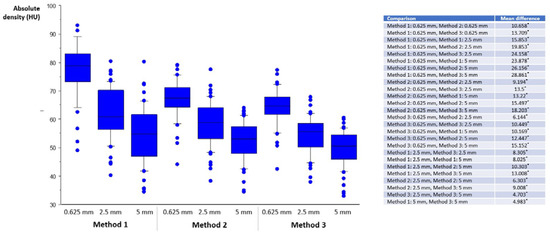 Absolute thrombus density. On the x-axis, slice thickness (0.625, 2.5, 5 mm) and the method of density measurements are listed (left three bars: Method 1; middle three bars: Method 2; right three bars: Method 3). For visual clarity, statistical significance (*, p < 0.05) is listed in the right-hand table. Median, 25th, and 75th percentile are displayed as boxplots, 10th and 90th as whiskers, dots represent outliers.