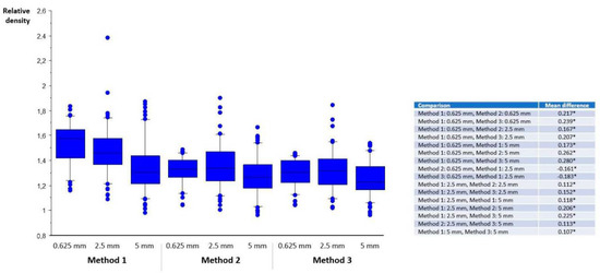 Relative thrombus density. On the x-axis, slice thickness (0.625, 2.5, 5 mm) and the method of density measurements are listed (left three bars: Method 1; middle three bars: Method 2; right three bars: Method 3). For visual clarity, statistical significance (*, p < 0.05) is listed in the right-hand table. Median, 25th, and 75th percentile are displayed as boxplots, 10th and 90th as whiskers, dots represent outliers.