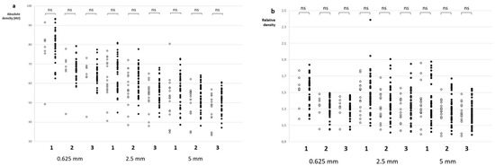 Comparison of absolute (a) and relative (b) thrombus density values in patients with TICI 200 < 2b (empty circles) and TICI ≥ 2b (solid circles). (ns: not significant, unpaired t-test).