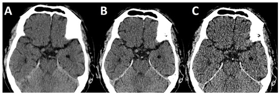 NECCT with 5 mm (A), 2.5 mm (B) and 0.625 mm (C) reconstructed slice thickness. Note the absence of a hyperdense basilar artery on 5 mm (A) slice thickness.