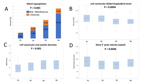 Changes in left ventricle parameters parallel to the increasing development of mitral regurgitation (A) The increasing development of mitral regurgitation during follow-up, in the presence of gradual left ventricle changes, including (B) reduction in left ventricular global longitudinal strain, (C) increase in left ventricular end-systolic diameter and (D) decrease in e’ septal values.
