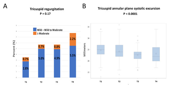 Caption Changes in right ventricle parameter parallel to the increasing development of tricuspid regurgitation (A) The increasing development of tricuspid regurgitation during follow-up, in the presence of reduction in (B) tricuspid annular plane systolic excursion values.