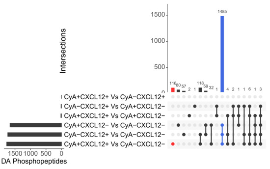 Differentially abundant (DA) phosphopeptides were identified using a linear model where the expression () for each phosphopeptide was expressed as a function of and treatment, i.e., . We used the lmFit function in the R package limma version 3.40.6 [26], available at https://www.bioconductor.org/packages/release/bioc/html/limma.html (accessed on 27 July 2019). Samples treated with CyA are described as CyA+, and samples treated with CXCL12 are described as CXCL12+ in the text. Combinations of treatments are described as CyA+CXCL12−, CyA−CXCL12+, etc. This model was used to identify DA phosphopeptides for six contrasts: CyA+CXCL12+ vs. CyA−CXCL12+, CyA−CXCL12+ vs. CyA+CXCL12−, CyA+CXCL12+ vs. CyA+CXCL12−, CyA+CXCL12− vs. CyA−CXCL12−, CyA−CXCL12+ vs. CyA−CXCL12−, and CyA+CXCL12+ vs. CyA−CXCL12−. Contrasts for each phosphopeptide were estimated using contrasts.fit and standard errors were smoothed using the eBayes function in limma. DA phosphopeptides were defined as those with an absolute fold change ≥1 and a Bonferroni-adjusted p value . The R package UpSetR version 1.4.0 [27], available at https://cran.r-project.org/web/packages/UpSetR/index.html (accessed on 26 July 2019), was used to visualize the intersections between the sets of DA phosphopeptides. Samples that were cultured at 19% O and 1% O were analyzed separately because batches were separated by O levels.