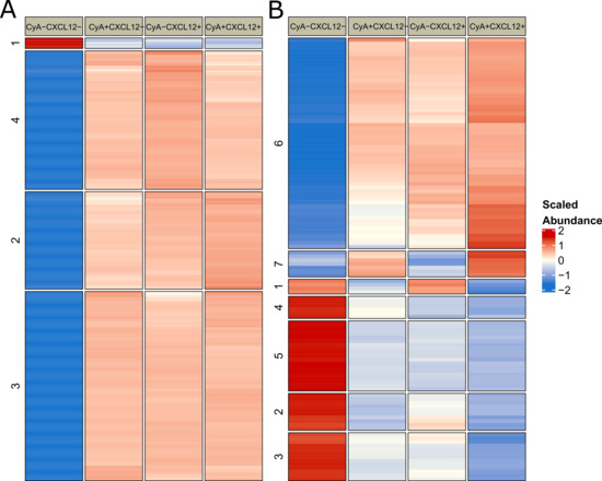 Median abundance for phosphopeptides that are differentially abundant between CyA+CXCL12+ and CyA−CXCL12− samples. (A) A total of 1485 differentially abundant phosphopeptides appear to be driven by either CyA or CXCL12. (B) A total of 116 differentially abundant phosphopeptides appear to be driven by the interaction between CyA and CXCL12.