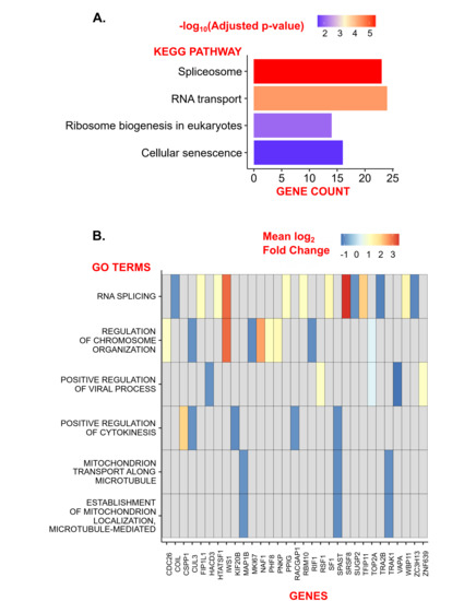 Separate CyA and CXCL12 treatments independently regulated the abundance of 80 and 57 phosphopeptides, respectively (Figure 1). These differentially abundant (DA) phosphopeptides were identified by comparing CyA+CXCL12− vs. CyA−CXCL12− and CyA−CXCL12+ vs. CyA−CXCL12− samples (Methods). A total of 1485 phosphopeptides overlap between these sets of DA phosphopeptides, suggesting a similar role of CyA and CXCL12 (Figure 1 and Figure 2A). Among these phosphopeptides, 1450 were upregulated and 35 downregulated upon CyA and CXCL12 treatment (Supplementary Figure S1). Gene set over-representation analysis demonstrated that the 1485 phosphopeptide-associated genes are involved in RNA processing and in cellular senescence (Figure 3A).