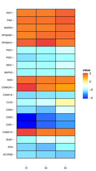 Kinase substrate analysis. The three columns of the heat map refer to the following three sets of comparisons: X1. CyA+CXCL12+ vs. CyA−CXCL12−; X2. CyA−CXCL12+ vs. CyA−CXCL12−; and X3. CyA+CXCL12− vs. CyA−CXCL12−.
