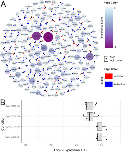 Differential abundance and discrete-state modeling show a potential role for LSP1 in the interaction between CyA and CXCL12. (A) A logic rule model of HIF1A-mediated hypoxia response and cytoskeletal rearrangement. A random subset of logic rules inferred by BONITA is shown. Nodes (except black nodes) represent proteins and black nodes represent inferred ’and’ logic gates. Incoming edges represent ’OR’ logic gates. The size of nodes is proportional to their importance score as calculated by BONITA, i.e., it is proportional to their influence over signal flow through the network. Nodes representing proteins are colored according to the fold change between CyA+CXCL12+ and CyA−CXCL12− samples as shown in the legend. Edges are colored by activation or inhibition signal as shown in the legend. (B) Abundance of an LSP1 phosphopeptide that is exclusively differentially abundant in the CyA+CXCL12+ vs. CyA−CXCL12− comparison at 1% O.