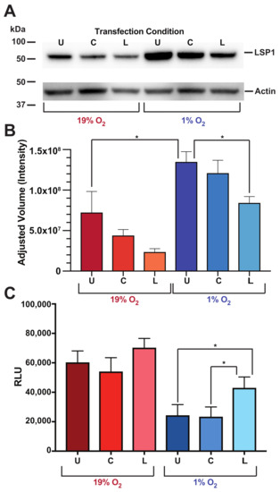 HIF-1 Western blots were performed on nuclear lysates prepared from cell pellets using NE-PER nuclear and cytoplasmic extraction kits (Thermo Fisher Scientific, Waltham, MA, USA) as previously described [3]. Western blotting for LSP1 was performed using whole-cell lysates prepared with RIPA lysis and extraction buffer, as recommended by the manufacturer (Thermo Fisher Scientific, Waltham, MA, USA). Proteins were resolved on precast NuPAGE 4–12% Bis-Tris protein gels (Invitrogen, Carlsbad, CA, USA) and transferred to a PVDF membrane (Bio-Rad, Hercules, CA, USA). The membrane was then blocked with 1X TBS-T (Tris-Buffered Saline (Bio-Rad, Hercules, CA, USA)) with 0.05% Tween-20 (Sigma-Aldrich, St. Louis, MO, USA) + 5% blotting grade nonfat dry milk (Bio-Rad, Hercules, CA, USA) for 1 h at room temperature on a rocker or overnight at 4 °C. Blots were then probed with a mouse antihuman LSP1 primary antibody (Santa Cruz Biotechnology, Dallas, TX, USA) at a dilution of 1:200 in TBS-T + 5% milk or a mouse antihuman HIF-1 primary antibody at a 1:250 dilution in TBS-T + 5% milk. As a loading control, blots were also probed with a 1:5000 dilution mouse antiactin primary antibody (BD Biosciences, San Diego, CA, USA). For both LSP1 and actin detection, a horse radish peroxidase (HRP) conjugated goat antimouse IgG secondary antibody (BD Biosciences, San Diego, CA, USA) was used at a dilution of 1:1000 in TBS-T + 5% milk, and blots were incubated for 1 h at room temp on a rocker. Blots were washed 3X with TBS-T and incubated on a rocker at room temperature for 5 min with freshly prepared Enhanced Chemiluminescence (ECL) substrate (Thermo Fisher Scientific, Waltham, MA, USA). Blots were imaged on a ChemiDoc MP imaging system. Densitometry was performed using Image Lab software version 6.0.1 (Bio-Rad, Hercules, CA, USA).