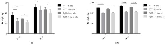 Effect of long-term HFD treatment on body weight in WT and Tff3-deficient mice of both sexes and age-matched controls fed a standard diet (n = 10 animals per group). (a) Body weight of 21-week- (21 w) and 36-week (36 w)-old mice fed an HFD from weaning; (b) body weight of 21-week- (21 w) and 36-week (36 w)-old mice fed an SD; * p ≤ 0.05, ** p ≤ 0.01, **** p ≤ 0.0001.
