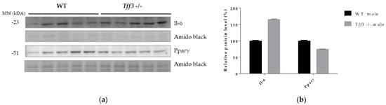 Total liver proteins were isolated from Tff3-/- and WT mice fed with an HFD for 8 months (n = 5 animals per group). RIPA buffer (50 mM TRIS HCL, pH8, 150 mM NaCl, 1 mM EDTA, 1% NP40, 1% sodium deoxycholate, 0.1% SDS) supplemented with phosphatase and protease inhibitors was used for isolation. Protein concentration was determined by a BCA protein assay kit (Pierce, Thermo Fischer, Waltham, MA, USA), and 10 µg of proteins per lane was separated by sodium dodecyl sulphate-polyacrylamide gel electrophoresis (SDS-PAGE). Proteins were transferred to a PVDF membrane overnight at the constant 100 mA. I-Block™ protein-based blocking reagent (T2015) was used for blocking for 1h. Il-6 primary antibody (ab208113) and Pparγ primary antibody (sc7196) were incubated overnight at 4 °C with dilutions of 1:1000. Goat anti-rabbit IgG-HRP (#170-6515; Bio-rad) was used for detection. The chemiluminescence signals were detected (Uvitec Alliance Q9 mini) and analysed with Image J (version 1.53s, National Institute of Health, Bethesda, MD, USA). Bands were normalized by amido black stain.