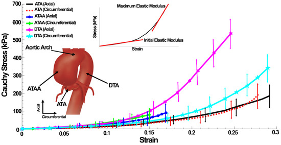 Cauchy stress–strain diagrams for the ATA, ATAA, and DTA in the axial and circumferential loadings. Schematic view of the aorta with locations where the aortic tissue was removed. Stress–strain curves and derivation of the initial and maximum elastic moduli.