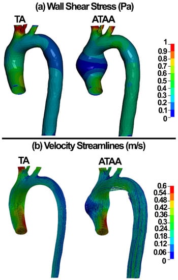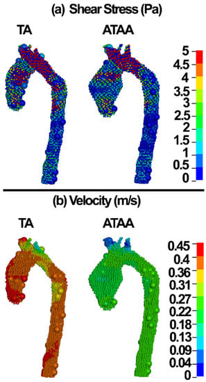 (a) Wall shear stress and (b) velocity in the blood components of the ATA and ATAA models.