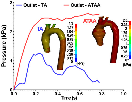 Outlet pressure boundary in the TA and ATAA from the CFD simulations. The flow pressure from the CFD simulations is also shown in the inset.