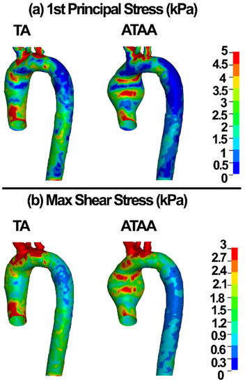 The first principal and maximum shear stresses in the TA and ATAA walls are shown in Figure 8.