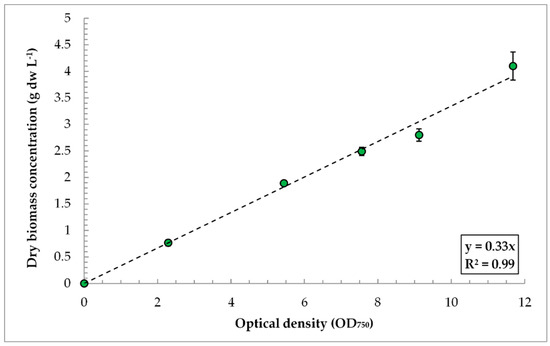 The coefficient of conversion of OD750 into absolute values of dry biomass weight per liter (g dw L−1) of suspension was estimated. Figure 3 shows the values of the biomass concentration of C. sorokiniana IPPAS C-1 corresponding to the various OD750 of the culture. The multiplier for converting the OD values into the value of biomass concentration corresponds to the slope of the linear trend line and is equal to 0.33. This conversion coefficient can be applied to all cases of C. sorokiniana IPPAS C-1 cultivation when measuring its OD750, regardless of the volumes and characteristics of the PBRs. In this work, the indicators of the PBRs’ productivity and efficiency were determined using the conversion coefficient k.