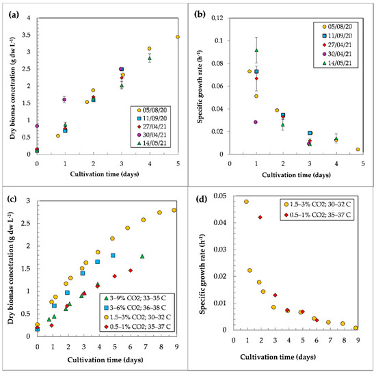 - Batch cultivation in PBR FPV-70 under the continuous average irradiation of 143 μmol photons m−2 s−1 at various CO2 concentrations and temperatures (Figure 4c,d).