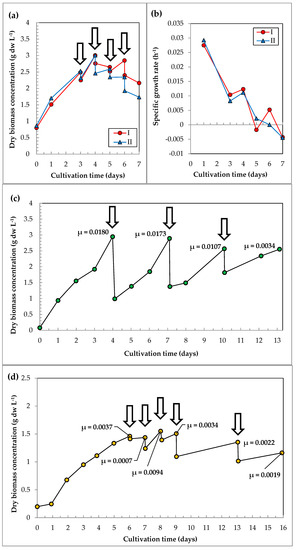 Growth characteristics of C. sorokiniana IPPAS C-1 grown in semi-continuous and combined modes. PBRs FPH-5 I and II, daily dilutions: (a) growth curves; (b) specific growth rates (h−1). (c) PBR FPH-5 II, 3-day periodic dilutions: growth curve and specific growth rates. (d) PBR FPV-70 in a combined mode: growth curve and specific growth rates. Arrows indicate the time of suspension withdrawal and dilution with the fresh growth medium. The individual data points are presented. µ—the specific growth rate.