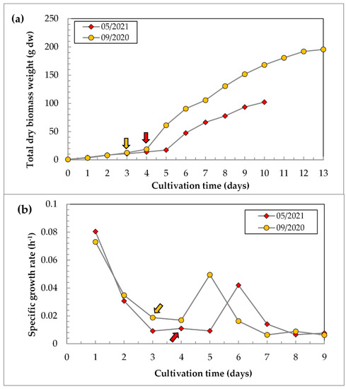 Growth characteristics of C. sorokiniana IPPAS C-1 in the batch mode, starting from the inoculation of the PBR FPH-5 until the end of the batch cultivation in the PBR FPV-70: (a)—accumulation of biomass in absolute values of dw; (b)—specific growth rate. Colored arrows represent the time of suspension transition from PBR FPH-5 to PBR FPV-70. Individual data points. Growth conditions are represented in Table S1 for the replicates (exp.code): 11/09/20–14/09/20 for orange data points and 14/05/21 II–18/05/21 for red data points. Average irradiation for PBR FPH-5—500 μmol photons m−2 s−1; for PBR FPV-70—143 μmol photons m−2 s−1.