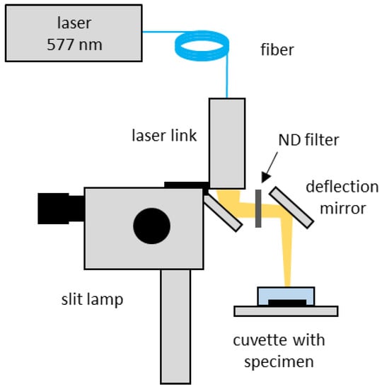 In order to perform the irradiation on the samples in the culture dish located horizontally as shown in Figure 1, a deflecting mirror (CCM1-P01/M, Thorlabs, Newton, NJ, USA) was fixed at an angle of 45° in front of the slit lamp with the laser link.