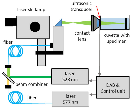 The set-up for simultaneous temperature measurements is shown in Figure 2. Temperature probing was performed by a Q-switched frequency doubled Nd:YLF-laser at a wavelength of 523 nm (QG-523-1000, CrystaLaser Inc., Reno, NV, USA), emitting pulses with 75 ns full width at half maximum (FWHM) pulse duration. The repetition rate was adjusted to twice the repetition rate of the treatment laser system and the pulse energy was set to 5 µJ for all experiments at the laser slit lamp. The beams of the treatment laser and the probe laser were combined with a dichroic mirror and transmitted via standard 50 µm core diameter fiber (NA = 0.11) to the laser slit lamp (SL 130, Carl Zeiss Meditec AG, Jena, Germany). A contact lens (Mainster focal/grid lens, Ocular Instruments, Bellevue, WA, USA) with integrated ultrasonic transducer to record the pressure waves (modified at Medical Laser Center Lübeck, Lübeck, Germany), was mounted into a cuvette filled with saline solution and containing the specimen. The transducer voltage was amplified (Panametrics, Olympus, Tokyo, Japan), filtered with a bandpass (400 kHz–1.5 MHz) and recorded with a fast data acquisition board (CompuScope 8347, Gage Applied Technologies Inc., Lockport, NY, USA). For controlling the experiment, synchronizing the components and data processing an in house developed software written in LABVIEW (NI, Austin, TX, USA) was used.