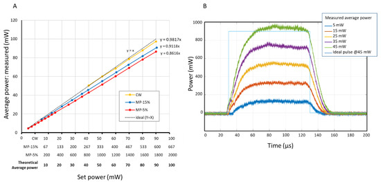 (A) Plots for the correlation between set laser power and the measured average laser power at the laser link for each mode. (B) Temporal profiles of a single laser pulse in micropulse mode with duty cycle of 5% for different average laser power settings.