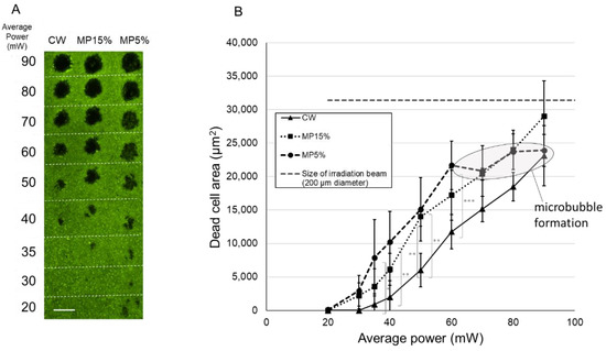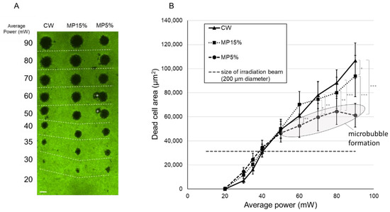 Figure 5A shows the representative image of calcein-AM viability staining 1 h after 20 ms irradiations. All DCAs were smaller than the irradiated spot size (31,400 µm2 area with 200 µm diameter, dashed line in Figure 5B) with the examined powers. The EC50 average laser power for the 50% probability of cell damage was calculated for 37 mW for CW, 27.5 mW for MP-15%, and 25 mW for MP-5%. Figure 5B shows that the DCA increased almost linearly with increased average power up to 90 mW with CW and MP-15%, whereas the slope was decreased with MP-5% at higher than 60 mW (Figure 5B, ellipse). At most average power settings up to 60 mW, DCA after MP-5% irradiations was significantly larger than after CW.