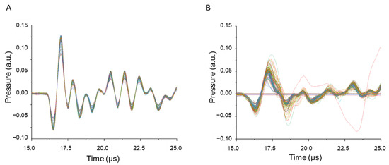 The experiments for temperature measurements were carried out with the set-up shown in Figure 2. Due to the beam combining, additional fiber coupling and non-optimized optics of the laser slit-lamp used here instead of the laser link, a 40% loss of the laser powers for the 577 nm radiation was measured behind the slit-lamp compared to the setting at the micropulse console. Due to the measured pulse repetition rate of 479.6 Hz of the system, corresponding to a pulse-to-pulse period of 2.085 ms, the probe lasers repetition rate was set to the double frequency of 959.2 Hz in order to obtain two data points for each DC period. All experiments were carried out with a pulse energy of 5 µJ measured behind the slit-lamp. The probe laser was synchronized with the laser system when operated in the 5%-mode, such that its pulses were always applied at the end of the emission of a micropulse (at 99 µs after switch on of every micropulse) giving a peak pulse RPE temperature Tmax,pulse(t), and between two micropulses providing an intermediate pulse RPE temperature Tmax,intermediate(t). The probe laser was switched on 10 ms prior to the treatment laser for every irradiation spot in order to calibrate each locations absorption to the samples base temperature in the cuvette of 22 °C. Figure 6 shows examples of the measured acoustic transients of a single spot superimposed to each other for the MP-5% mode with average powers of (a) 40 mW and (b) 50 mW. Figure 6A shows a very reproducible and phase stable transients with monotonously increasing amplitude from which the temperature increase was calculated according to Equations (2) and (3). Figure 6B displays a reduced phase and amplitude stability and one strongly deviating transient. The amplitude and phase changes account for tissue changes and microbubble formation. Note the lower amplitudes and lower frequencies of the pressure transients in Figure 6B compared to Figure 6A even though the applied power was higher. This can likely be attributed to a laser spot site offside the acoustic axis of the transducer that leads to higher acoustic interference.