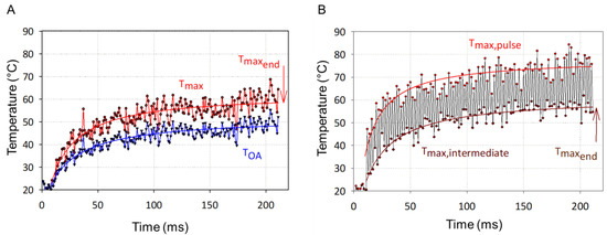 The blue curve in Figure 7A shows the course of the mean optoacoustic volume temperature TOA(t) determined with the measured pressure amplitude P(t) by use of Equation (2) for the CW mode, while the red curve shows the peak temperature Tmax on the beam axis at the RPE, calculated by means of Equation (3). Figure 7B shows the RPE temperature values Tmax,intermediate measured at the end of each micropulse (red dots and red hyperbolic regression curve), and Tmaxend intermediately between two micropulses (brown diamonds and hyperbolic regression curve). The temperature showed a stepwise temperature increase, oscillating with a temperature difference of about 20 °C between the two measurement points.