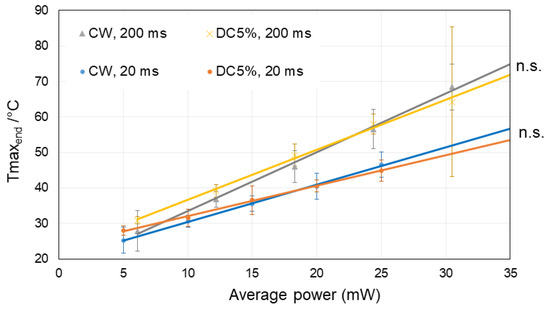 Comparison of the achieved maximal temperatures at the end of the irradiation time (Tmaxend) between CW and MP-5% modes for 200 ms and 20 ms irradiations, respectively, for different average powers including the probe power up to 30 mW. There was no significant difference between CW and MP-5% for the same irradiation time. Mean values are plotted and standard deviations are displayed as error bars. Statistical analysis was conducted by one-way Analysis of Variance (ANOVA) with Tukey’s multiple comparison, using the statistic software GraphPad PRISM (Ver. 7.04). n.s.—not significant.