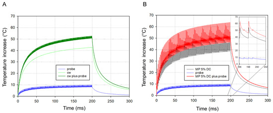 Simulations of the temperature increase during irradiation: (A) for the CW mode (25 mW) plus probe power (5 mW) and (B) for the MP mode with 5% DC at a peak power of about 500 mW, which leads to the same average laser power of 25 mW, plus probe power (5 mW). The inlay shows a magnification at the end of the irradiation.