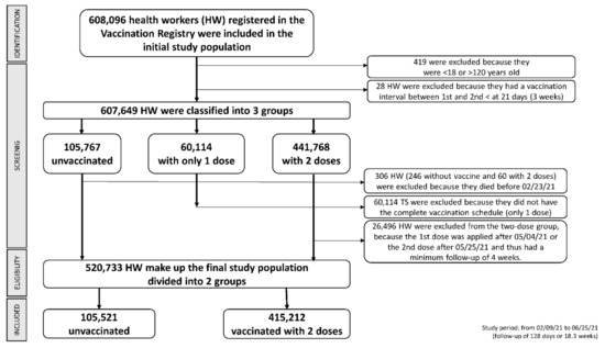 - Hall, V.J.; Foulkes, S.; Saei, A.; Andrews, N.; Oguti, B.; Charlett, A.; Wellington, E.; Stowe, J.; Gillson, N.; Atti, A.; et al. COVID-19 vaccine coverage in health-care workers in England and effectiveness of BNT162b2 mRNA vaccine against infection (SIREN): A prospective, multicentre, cohort study. Lancet 2021, 397, 1725–1735. [Google Scholar] [CrossRef]