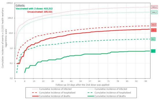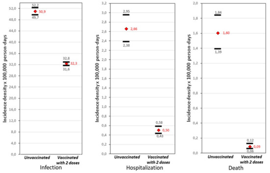 | Categories, Outcomes, and Vaccination Status | Events | Persons-Days of Follow-Up | Incidence Density per 1000 Days of Follow-Up | Crude Incidence Density Ratio (CI 95%) | z | p-Value | Effectiveness of the 2 Doses of the Vaccine (CI 95%) ** |