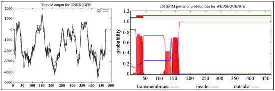 Transmembrane structure prediction of IrUGT86A1-like protein by TMpred (A) and TMHMM Server (B).