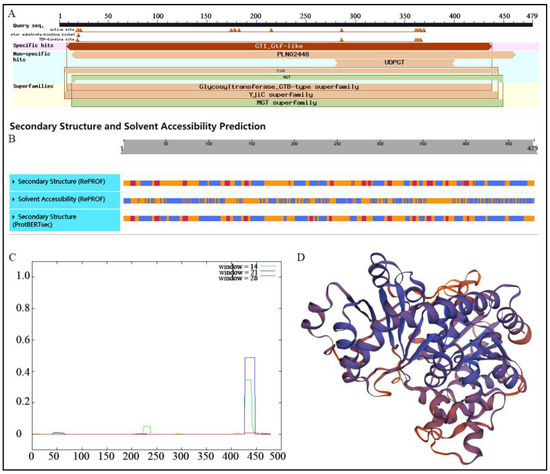 Structural analysis of IrUGT86A1-like protein. Conserved domains (A), secondary structure (B), COILS analysis (C), and 3 D structure (D) prediction of IrUGT86A1-like protein.