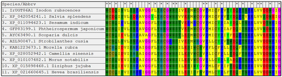 The amino acid sequence of IrUGT86A1-like protein was uploaded and searched against the nr non-redundant protein database with using the online software Protein BLAST from NCBI, and other plant UGT86A1 proteins with high homology to the query amino acid sequence of IrUGT86A1-like in I. rubescens were obtained. The amino acid sequences of IrUGT86A1-like from I. rubescens, Salvia splendens, Sesamum indicum, Phthemospermum japonicum, Scoparia dulcis, Strobilanthes cusia, Morella rubra, Camellia sinensis, Morus notabilis, Ziziphus jujuba, and Hevea brasiliensis were compared with MEGA software. The UGT86A1 protein of different species was found to be highly conserved in the conserved region (Figure 4).