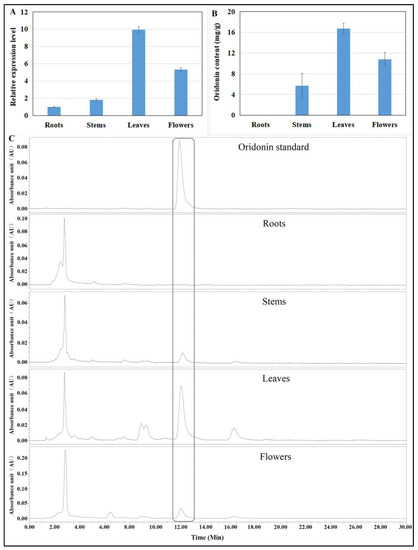 In addition to the expression profiles of the IrUGT86A1-like gene in different tissues of I. rubescens, the content of oridonin in these tissues was determined. Leaves contained the greatest oridonin content, followed by flowers, then stems, and roots had the extremely low oridonin content (Figure 6B,C). These results showed that the content of oridonin in different tissues varied with the expression level of the IrUGT86A1-like gene in different tissues.