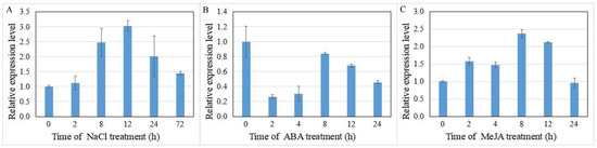 Expression of the UGT gene has been reported increase in plants subjected to various stress conditions. Herein, the expression of IrUGT86A1-like under abiotic stress was further investigated here, and our results demonstrated that IrUGT86A1-like expression changed with NaCl, ABA, or MeJA treatments (Figure 7). For NaCl and MeJA treatments, the expression of IrUGT86A1-like gene initially increased and then decreased over time. The expression of IrUGT86A1-like gene was the greatest after 12 h of NaCl treatment, which was 3.03-fold higher than the baseline expression of the untreated control (Figure 7A). The expression of IrUGT86A1-like was the highest after 8 h of MeJA treatment, which was 2.37-fold higher than the untreated control expression level (Figure 7B). In regards to the ABA treatment, the expression of IrUGT86A1-like gene was significantly decreased, and the expression was the lowest 2 h after ABA spraying, indicating that IrUGT86A1-like gene is sensitive to ABA (Figure 7C).