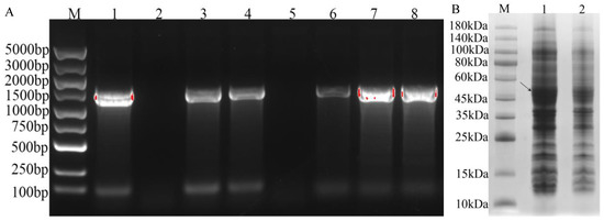 PCR identification and SDS-PAGE analysis of recombinant protein of IrUGT86A1-like. (A) PCR identification of recombinant plasmid of IrUGT86A1 (M: DL5000 DNA Maker; 1~8: PCR identification of pEASY-Blunt E1-IrUGT86A colony); (B) SDS-PAGE analysis of IrUGT86A recombinant protein (M: Standard molecular weight of protein; 1: pEASY-Blunt E1-IrUGT86A induced by IPTG; 2: pEASY-Blunt E1-IrUGT86A was not induced by IPTG); The arrow indicate the target IrUGT86A1-like protein.