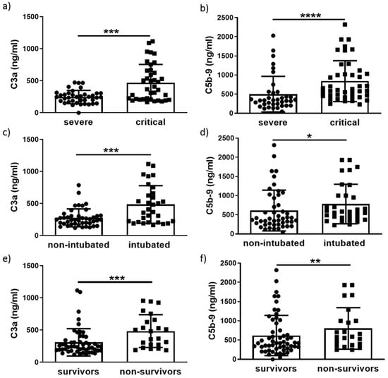 Increased levels of C3a and C5b-9 in COVID-19 patients. C3a and C5b-9 levels measured on admission were higher in critically ill compared to patients with severe COVID-19 (a,b), in intubated versus non-intubated (c,d), and in non-survivors compared to survivors (e,f). Data are expressed as means ± SD. Statistical analysis was performed using the Mann–Whitney U test. * p < 0.05, ** p < 0.01, *** p < 0.001, **** p < 0.0001.