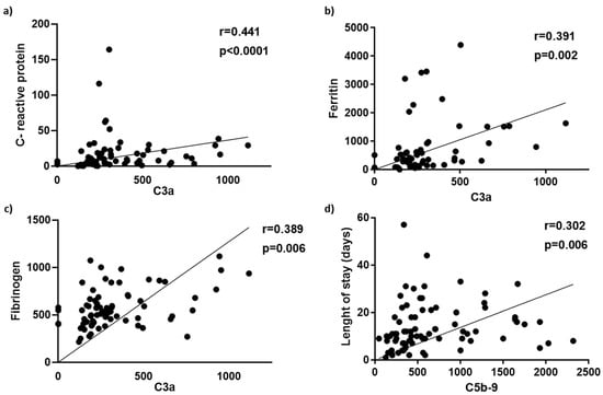C3a and C5b-9 levels correlations in COVID-19 disease. C3a levels correlated positively with (a) C-reactive protein, (b) ferritin and (c) fibrinogen levels. (d) A positive correlation between C5b-9 levels with patient hospital length of stay (ward/ICU).