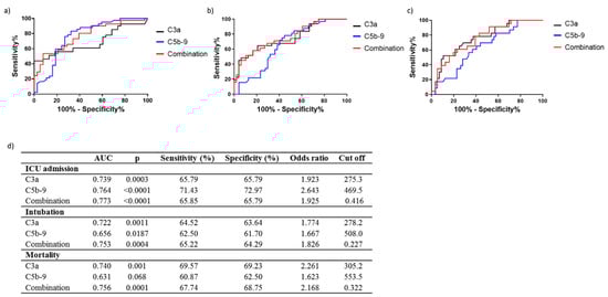 Increased levels of C3a and C5b-9 in COVID-19 patients differentially predict ICU admission, intubation and mortality. Receiver operating characteristic curves for prediction of need for intensive care treatment (a) intubation (b) and survival (c). (d) Corresponding area under the curve (AUC), p values, and optimal cut-off points with combined greatest sensitivity (%) and specificity (%) and odds ratio values are shown.