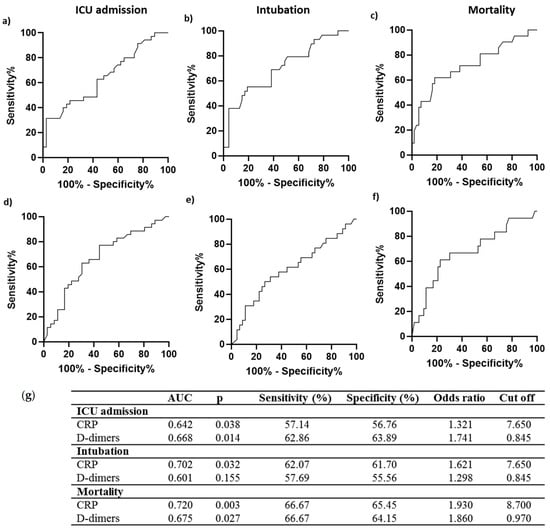 Prediction of ICU admission, intubation and mortality by C-reactive protein and D-dimers. Receiver operating characteristic (ROC) curves of C-reactive protein for prediction of need for intensive care (a) intubation (b) and mortality (c) and D-dimer levels (d–f). The corresponding areas under the curve (AUC), p, sensitivity and specificity, odd ratio, and cut-off values are represented in (g).