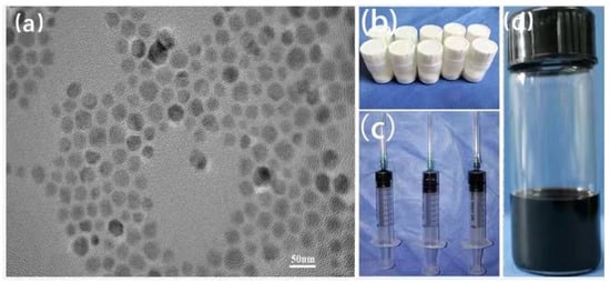 The design and synthesis of magnetic bone cement to treat bone metastases has been reported [,]. However, the threads used in those experiments were iron powder or micron-dimensional ferrite nanoparticles at an early stage []. Due to the poor heating efficiency of these threads, investigators had to increase the weight percent in the magnetic bone cement to reach the clinical hyperthermia temperature (43 °C), sometimes by up to 40–60% [,]. Nevertheless, with this increase, the physicochemical properties of bone cement will be modified, including the mechanical strength, setting time, and polymerization temperature. Accordingly, the heating efficiency of the magnetic nanoparticles improves to decrease the weight percent, and the modification of the physicochemical properties of the bone cement matrix will be minimized.