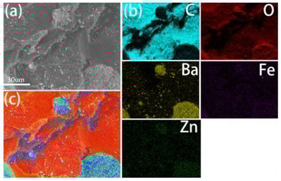 The solidified magnetic bone cement is shown in Figure 1c. The PMMA doped with 1 wt% Zn0.3Fe2.7O4 nanoparticles is black. The polymerized PMMA was densely distributed, and barium sulfate particles were embedded in the PMMA. Barium sulfate particles were doped as radiopaque agents, by which we were able to obtain clear and precise images in the process of injection. The results of the element distribution (EDS) mapping (Figure 2a–c) show that the Zn and Fe elements were uniformly distributed in the PMMA matrix.