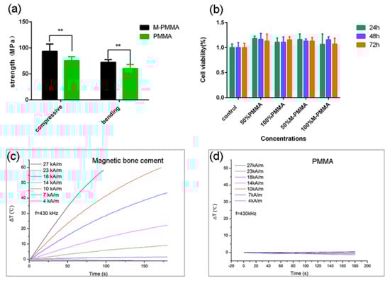 (a) Mechanical strength of PMMA-Zn0.3Fe2.7O4 bone cement comparable to PMMA. (b) Cytotoxicity of PMMA-Zn0.3Fe2.7O4 and PMMA bone cement leaching solution. (c,d) Heating curve of PMMA-Zn0.3Fe2.7O4 and PMMA bone cement in AMF (f = 430 kHz) (** p < 0.01).